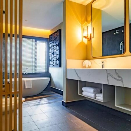 • يشمل الحمّام الفسيح حوض استحمام ولوازم استحمام مجانية.